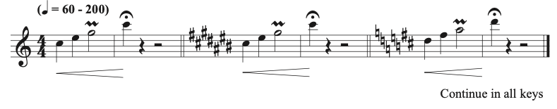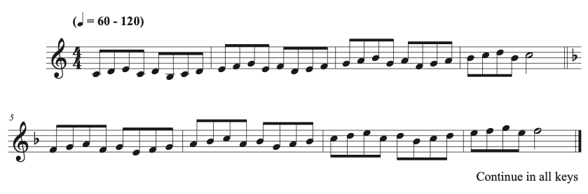 Exercise 2 and Exercise 3: in all keys and tonalities to work on my articulations. I vary my articulations to include all the mentioned articulations. I also practice these exercises straight and swing. With Exercise 3, I will also adjust the rhythm to address my specific needs. Be creative in your Practice and compose the exercises that target your weaknesses.